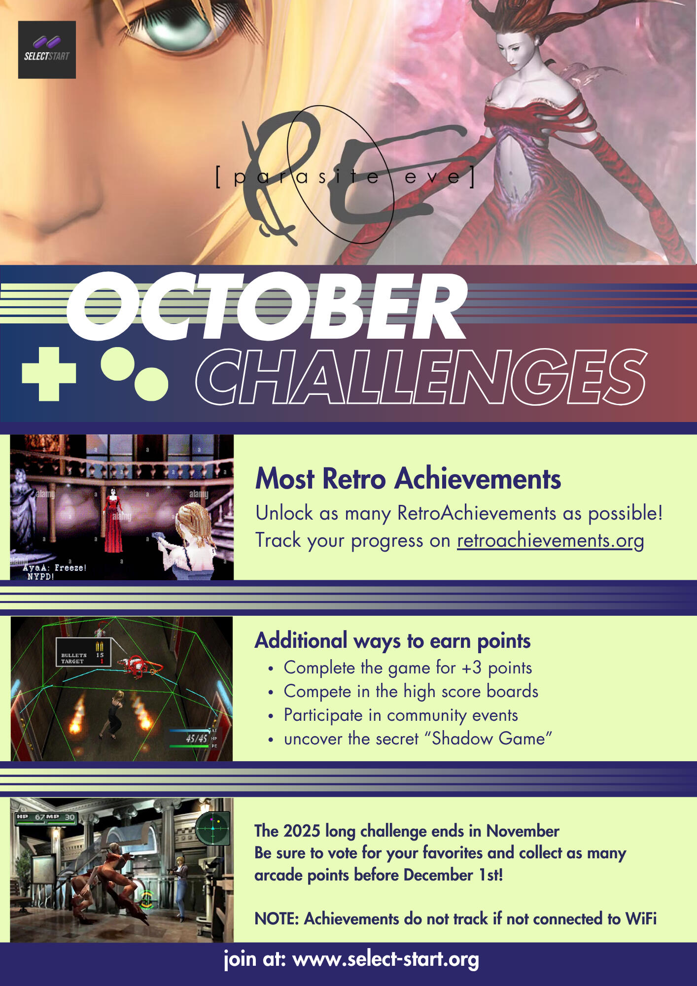 October chills bring mitochondria thrills! After September’s journey, it’s time to step into the eerie streets of New York City and confront a horror unlike any other. This month’s challenge takes us to the PlayStation classic Parasite Eve, where cinematic storytelling collides with RPG strategy and survival horror vibes.Join Aya Brea as she battles against terrifying mutations, unravels the mysteries of her own powers, and faces down the twisted being known as Eve. Rack up RetroAchievements as you master the Active Time Battle system, manage resources carefully, and survive every unsettling encounter in this genre-defining adventure.As always, bonus point opportunities are live—check the Discord for the full breakdown. And don’t forget: voting for November’s game is now open! Make sure to earn points in the Arcade to climb the leaderboard before the year-long competition wraps up on December 1st.